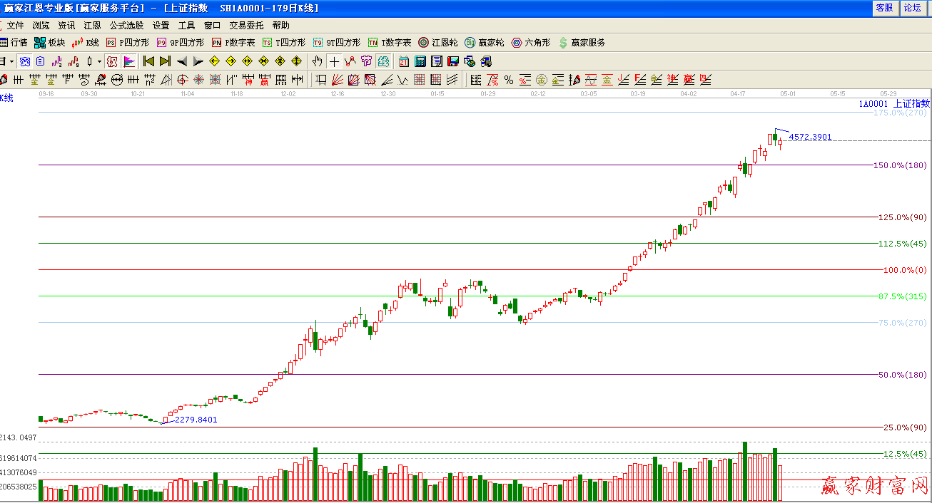 ★依據(jù)贏家江恩理論系統(tǒng)波段百分比提示:江恩百分比180度4300點(diǎn)附近支撐線,此位置不破整體趨勢不變,上方下一目標(biāo)位是270度,4700點(diǎn)附近。