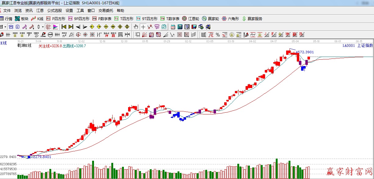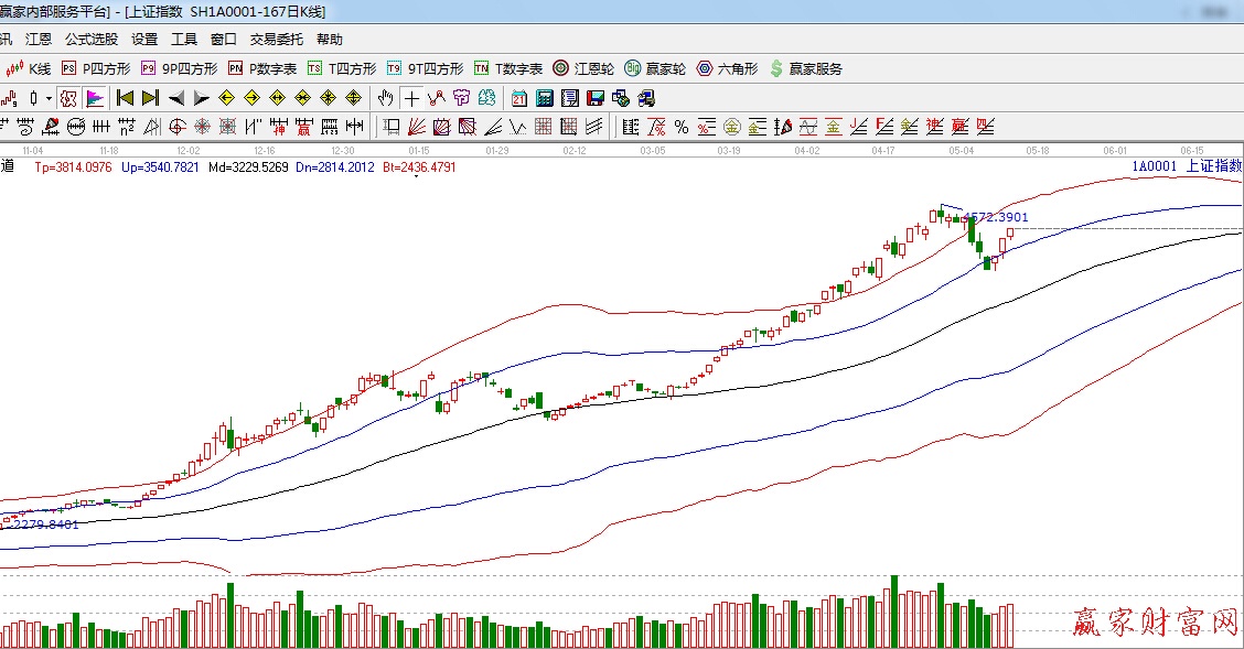 極反通道提示:滬指重新回到藍(lán)色外軌線之上,藍(lán)色外軌線轉(zhuǎn)換為支撐,趨勢看多。