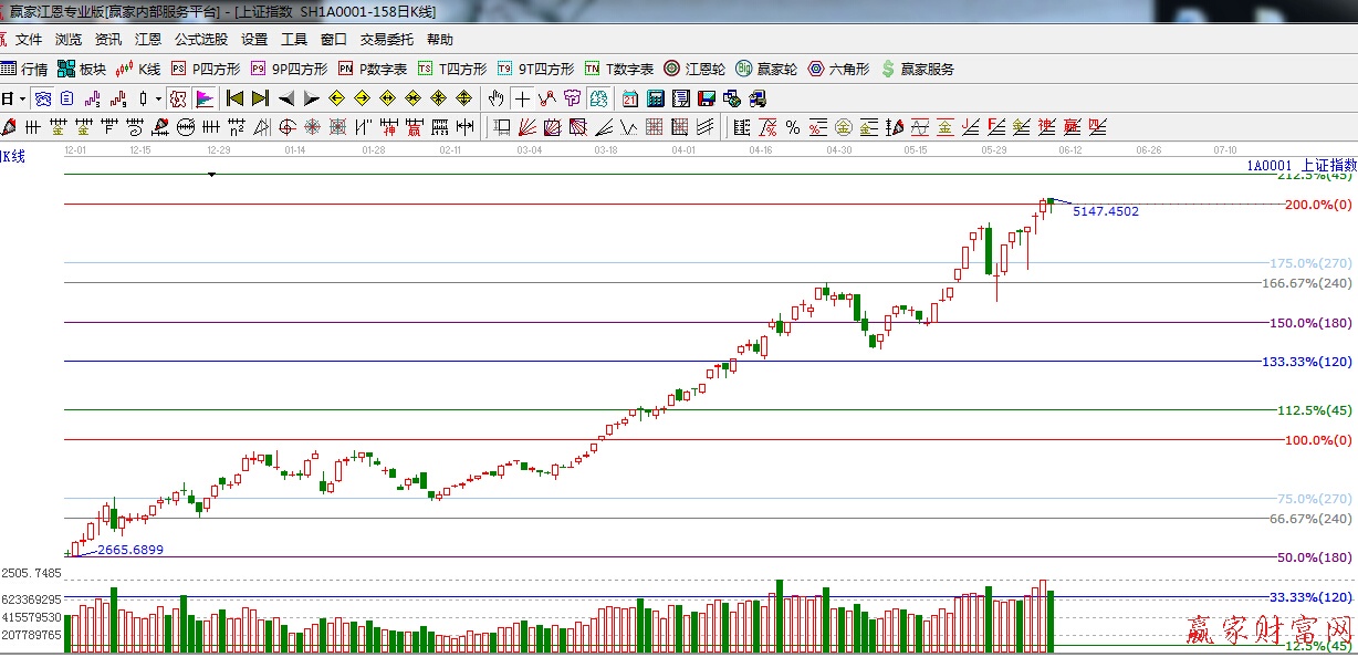 ★依據(jù)贏家江恩理論系統(tǒng)波段百分比提示:滬指在權(quán)重大帶動(dòng)下站上5100點(diǎn),下一目標(biāo)是江恩45度5300附近點(diǎn)。