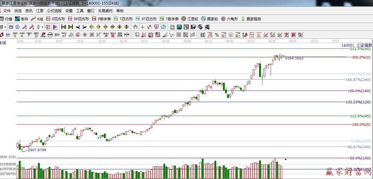 ★依據(jù)贏家江恩理論系統(tǒng)波段百分比提示:滬指在權(quán)重大帶動(dòng)下站上5100點(diǎn),下一目標(biāo)是江恩45度5300附近點(diǎn)。