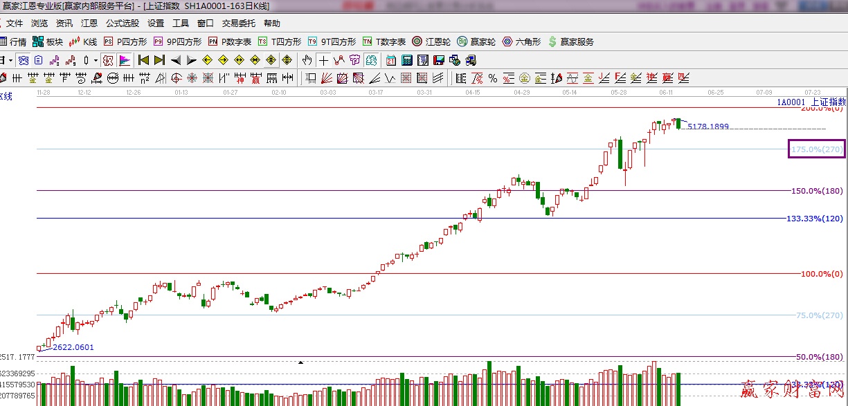 ★依據(jù)贏家江恩理論系統(tǒng)波段百分比提示:近期滬指高位滯漲,上方阻力位是5300點附近,下方支撐關注江恩270度4837點附近。