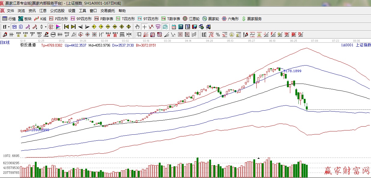 江恩看盤綜述:依據(jù)贏家江恩技術工具分析得出:周末再發(fā)重大利好,7月4日由21家證券公司將以合計不低于1200億元,用于投資藍籌股ETF.4日晚間,IPO發(fā)行正式被要求暫停,券商1200億救市是前所未有的救市措施,加上IPO暫停,市場的供求關系將發(fā)生變化,在國家不斷發(fā)力救市的情況下,市場短時期起碼能夠穩(wěn)定下來,技術面,近期一直提到極反通道藍色弱勢外軌線附近震蕩筑底,依據(jù)物極必反原則短期將有反彈。明天的多空決戰(zhàn)日,預計會出現(xiàn)報復性上漲