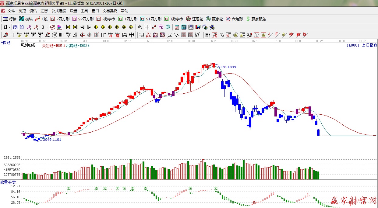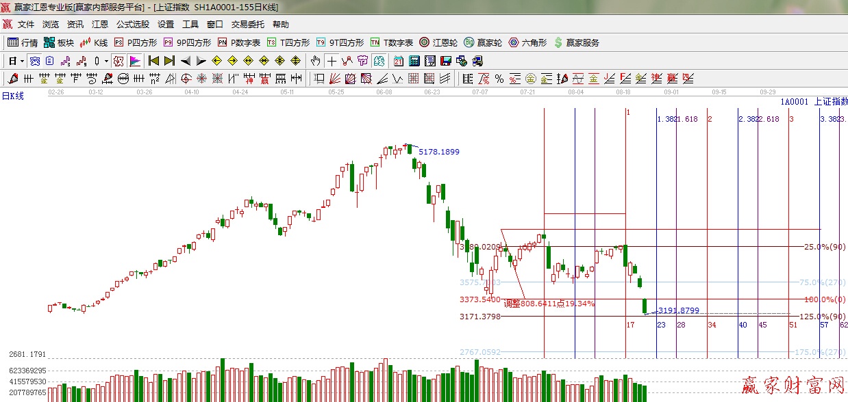 江恩看盤綜述:依據(jù)贏家江恩技術工具分析得出:周一滬指開盤即跌破前期低點3373點,隨繼破位年線,強烈打擊了投資者信心,盤中一度跌逾9%,雖然萬億養(yǎng)老金獲準入市,也拖不起沒有人氣的市場,技術面,明日依然關注江恩90度3171點附近支撐,此位置如破位,短周期將直逼3053--2972附近,日線支撐在江恩270度2767點附近,時間上,8月26日,9月2日。目前A股正處于一個中期夯實底部過程中,投資者的首要任務是保護好資金,等待時機。