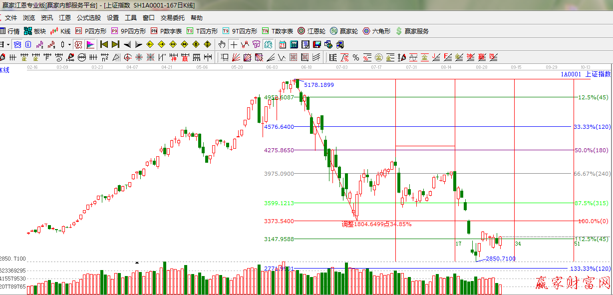 ☆依據(jù)贏家江恩理論系統(tǒng)極反通道提示:60分在弱勢(shì)外軌線位置橫盤震蕩,逐步推移至生命線附近,60分生命線阻力是3250點(diǎn)。