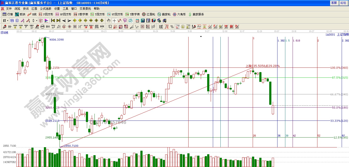 ☆ 依據贏家江恩理論系統(tǒng)江恩波段百分比線提示:周二滬指在3200附近止跌回升,明日阻力位留意 3328點,3407點附近。支撐留意180度3267點.