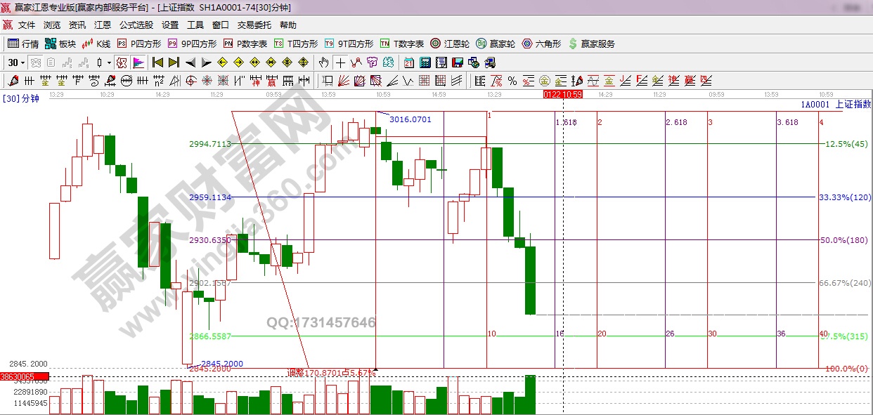 ☆ 依據(jù)贏家江恩理論系統(tǒng)江恩波段百分比線提示:短周期30分阻力位2902,下方支撐2866點,2823點,2788點。