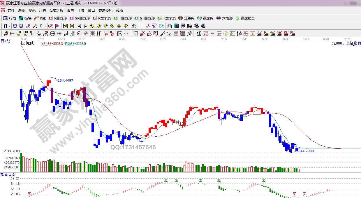 ☆ 依據(jù)贏家江恩理論系統(tǒng)乾坤K線提示:藍(lán)色休息區(qū)域,綠色出局線之下,空