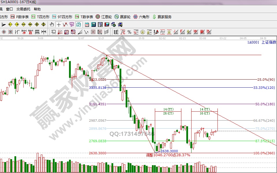 ☆依據(jù)贏家江恩理論系統(tǒng)極反通道提示:目前面臨極反通道生命線阻力,非常關鍵的位置,生命線2905點。