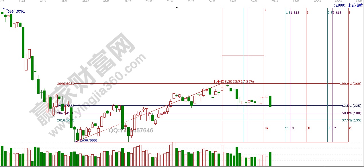 江恩看盤綜述:依據(jù)贏家江恩技術(shù)工具分析得出:近期市場無量震蕩上行,在5月6日窗口,股指如期迎來下跌,下周一如有反抽,應(yīng)逢高降低倉位,不要搶反抽,大盤下方仍有空間,支撐在180度2868點,以及135度2810點附近。時間上下一窗口在5月17日左右。