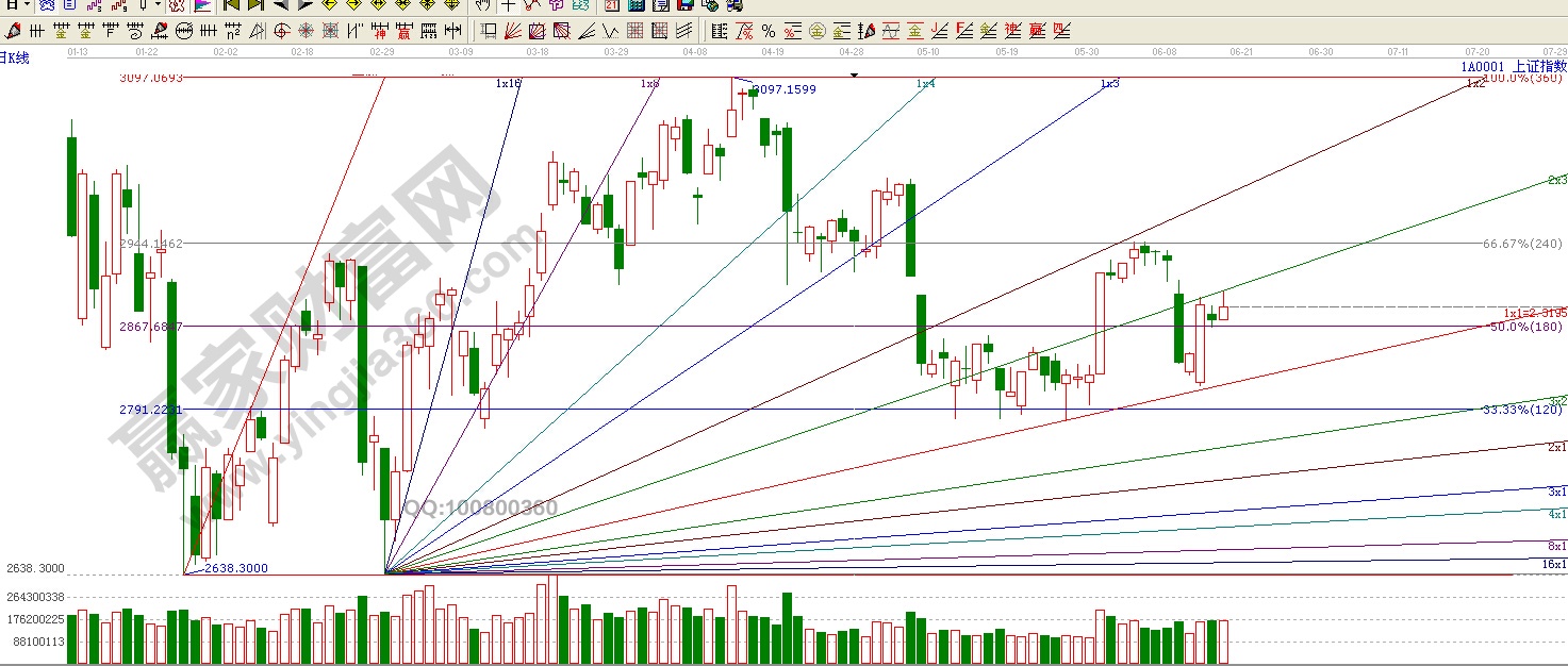 ☆依據(jù)贏家江恩理論系統(tǒng)江恩波段百分比線提示:阻力位江恩角度線2x3線2895點附近,180度支撐2863點附近。