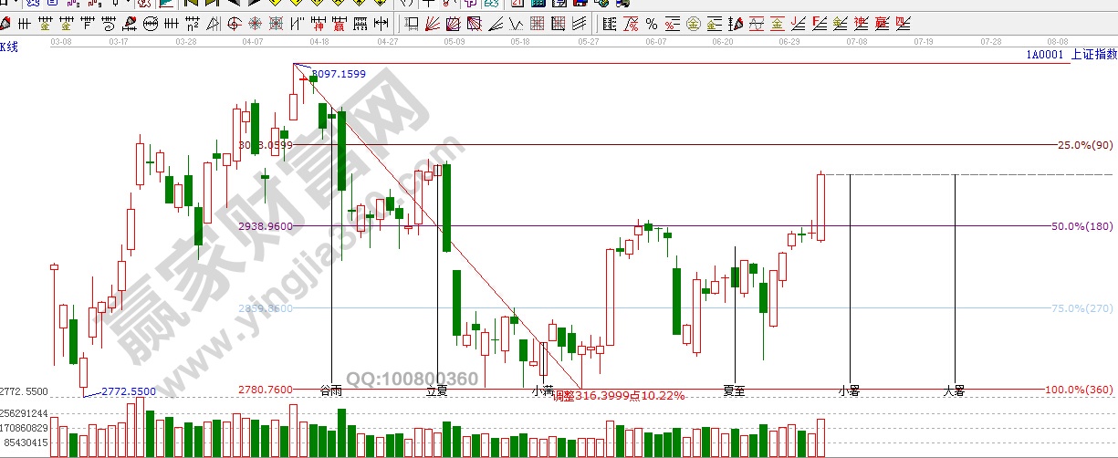 江恩看盤綜述:依據(jù)贏家江恩技術(shù)工具分析得出:周一,市場放量突破2800~2944點(diǎn)箱體頂部,接下來2944,2960點(diǎn)轉(zhuǎn)變?yōu)橹?,后續(xù)動能持續(xù),將有望繼續(xù)上攻下一目標(biāo)位江恩90度3018點(diǎn)附近,時間上留意小暑節(jié)氣7月7日附近,操作上,逢低可逐步加倉,重點(diǎn)關(guān)注中報高送轉(zhuǎn)標(biāo)的外,還可積極跟蹤底部啟動的滯漲品種的補(bǔ)漲機(jī)會。