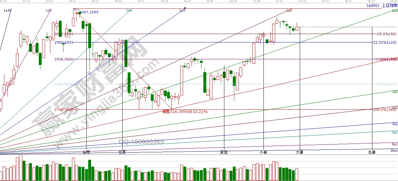 江恩看盤綜述:依據(jù)贏家江恩技術(shù)工具分析得出:周四,是21日時(shí)間窗口,兩市指數(shù)盤中震蕩較大,整體成沖高回落走勢(shì),最高沖至3053點(diǎn),由于量能不濟(jì)展開回落,周五是大暑節(jié)氣,如仍不能放量收復(fù)3055點(diǎn),3070點(diǎn)的話,預(yù)計(jì)短期內(nèi)震蕩調(diào)整仍為主基調(diào)。大暑后下一時(shí)間點(diǎn)在8月1日附近。操作上,可梳理半年報(bào)相關(guān)標(biāo)的,提前布局具有業(yè)績(jī)和數(shù)據(jù)支撐的高成長(zhǎng)績(jī)優(yōu)股。