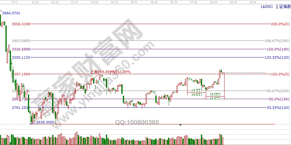 ☆依據(jù)贏家江恩理論系統(tǒng)江恩波段百分比線提示:滬指如期震蕩整理,從2638到3097點(diǎn)做波段百分比延伸線,支撐位3095點(diǎn),3070點(diǎn)。上方阻力位45度線3140點(diǎn),120度線3250點(diǎn)。