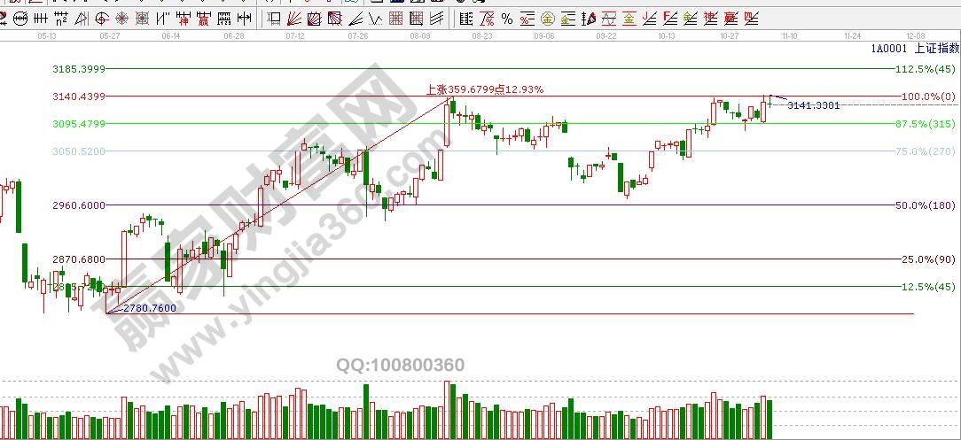 ★依據(jù)贏家江恩理論系統(tǒng)江恩波段百分比線提示:滬指支撐270度3095點,盤中突破3140點新高,此位置一旦收復,下一目標位3185點附近。