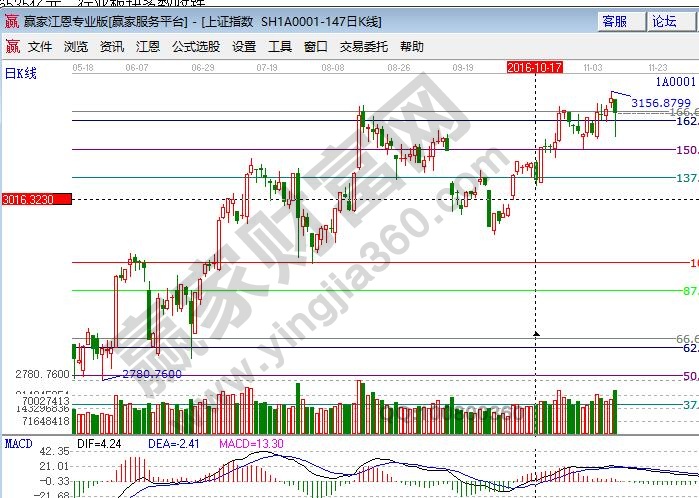 板塊方面,黃金概念、S股、OLED、股權(quán)轉(zhuǎn)讓、民營醫(yī)院、房地產(chǎn)等板塊漲幅居前。券商信托、工程機(jī)械、船舶、保險(xiǎn)、鐵路基建、海工裝備等板塊跌幅居前。美國大選落幕,A股市場也將回歸理性,從新回到自身的運(yùn)行軌跡。技術(shù)方面,短周期15分鐘失守生命線,30、60分鐘在生命線徘徊,預(yù)計(jì)明日短線還會(huì)有反復(fù),同時(shí)今日快速的下探也洗出一波浮籌,波段趨勢以震蕩上行的走勢觀點(diǎn)不變。