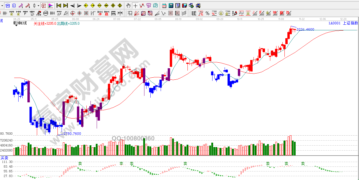 ★依據(jù)贏家江恩理論系統(tǒng)乾坤K線提示:紅色區(qū)域,短線出局線之上,看多。