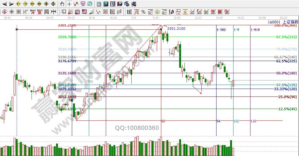 ★依據(jù)贏家江恩理論系統(tǒng)江恩波段百分比線提示:周二滬指回踩120度3079點附近后回升,阻力依然是180度3135點附近,支撐依然是3093點附近。