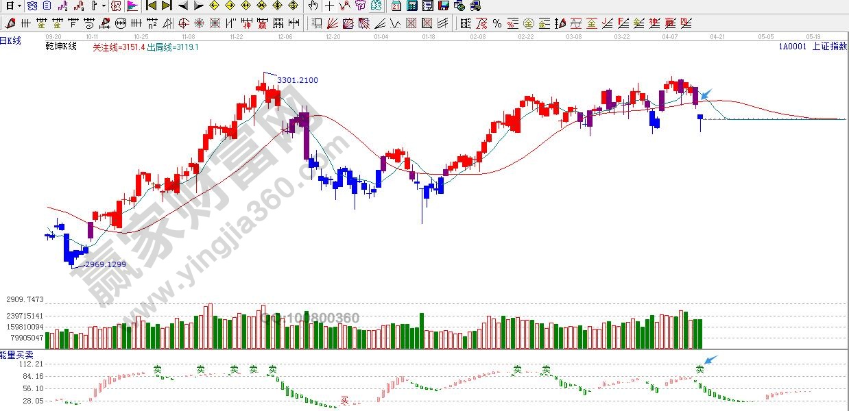 ☆依據(jù)贏家江恩理論系統(tǒng)能量買賣提示:紅色能量柱消失,并伴隨“賣”字出現(xiàn),依據(jù)規(guī)則看空。