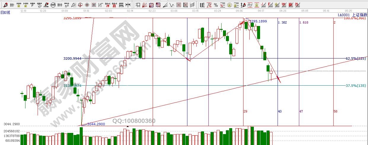 江恩看盤綜述:依據(jù)贏家江恩技術(shù)工具分析得出:周四,滬指午后小幅跳水,再次回探江恩135度支撐線后回升,昨天分析中已經(jīng)提到將有短線回抽動作,今日一帶一路以及金融股盤中表現(xiàn),護(hù)盤跡象較為明顯。在此基礎(chǔ)下,股指短期仍有小幅回抽機(jī)會,空間上先關(guān)注缺口3189--3196點,留意反彈的力度以及成交量的釋放,另外,介于目前整體趨勢處于日線生命線之下弱勢。操作上,輕倉博弈為主,整體倉位5成以下。時間周期,近期4月25日、5月2日。板塊上,波段關(guān)注雄安新區(qū),一帶一路、軍工等板塊。