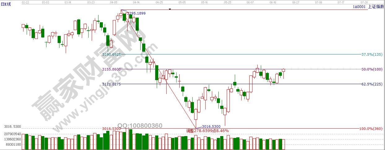 ★依據贏家江恩理論系統(tǒng)江恩波段百分比線提示:周一回踩225度3120附近展開回升,當前180度線是3155點,今日收盤3156點,此位置突破收復,不排除有機會去攻擊3190點附近。