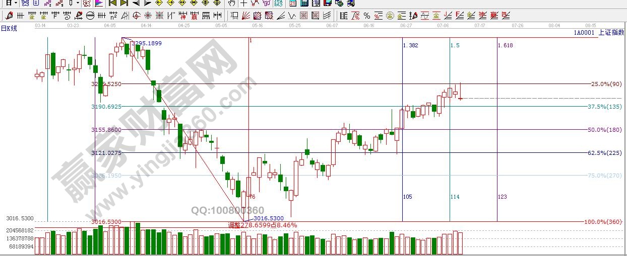 盤面上,金融權重支撐指數,上證50指數再次突破新高,而煤炭、有色等展開回調,次新股表現低迷;貝因美公司一季度實現凈利潤1092.36萬元同比下降81.81%,市場預期中報業(yè)績不佳,而今日午后,貝因美股價跳水,封死跌停。近期中報炒作的同時,對于業(yè)績較差的標的,盡量避而遠之。技術上,周二,滬指向上試探江恩90度3225點附近展開跳水,近期3200點之上滯漲明顯,目前距離極反通道藍色阻力線3238點也近在咫尺。1.5倍的關鍵窗口,短期有調整需求,短線支撐3190點,3155點附近。操作上保持謹慎,建議逢高減持近期累計漲幅較大的標的。嚴格控制倉的前提下關注中報業(yè)績預增良好的滯漲股。