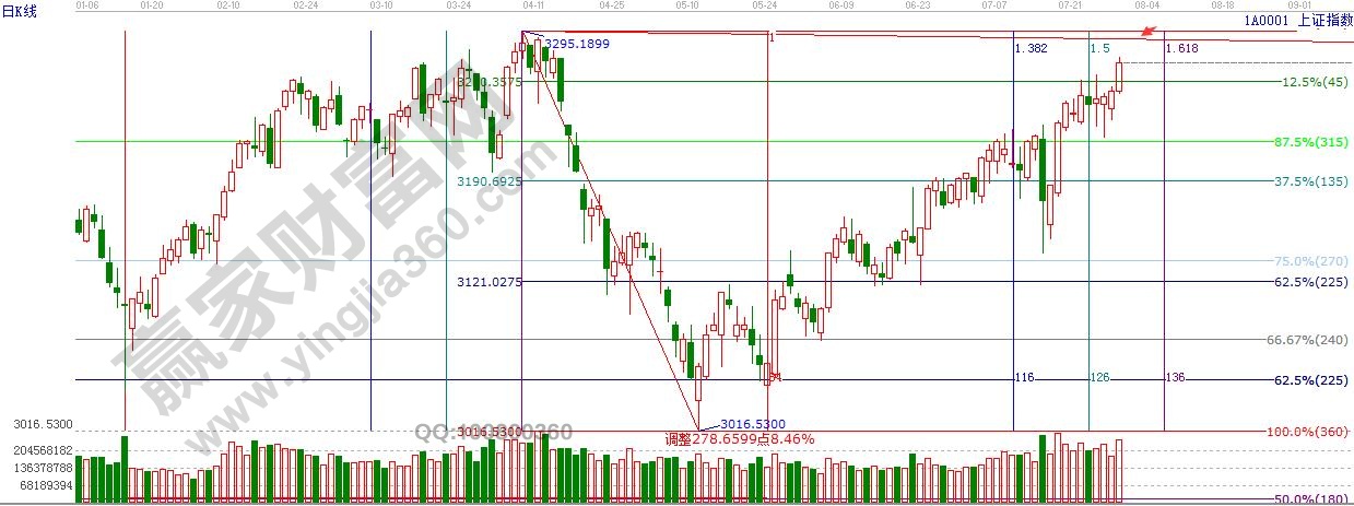☆依據(jù)贏家江恩理論系統(tǒng)黃金時(shí)間周期線提示:寬幅整理后,滬指再次創(chuàng)下新高。下一下窗口8月8日附近。