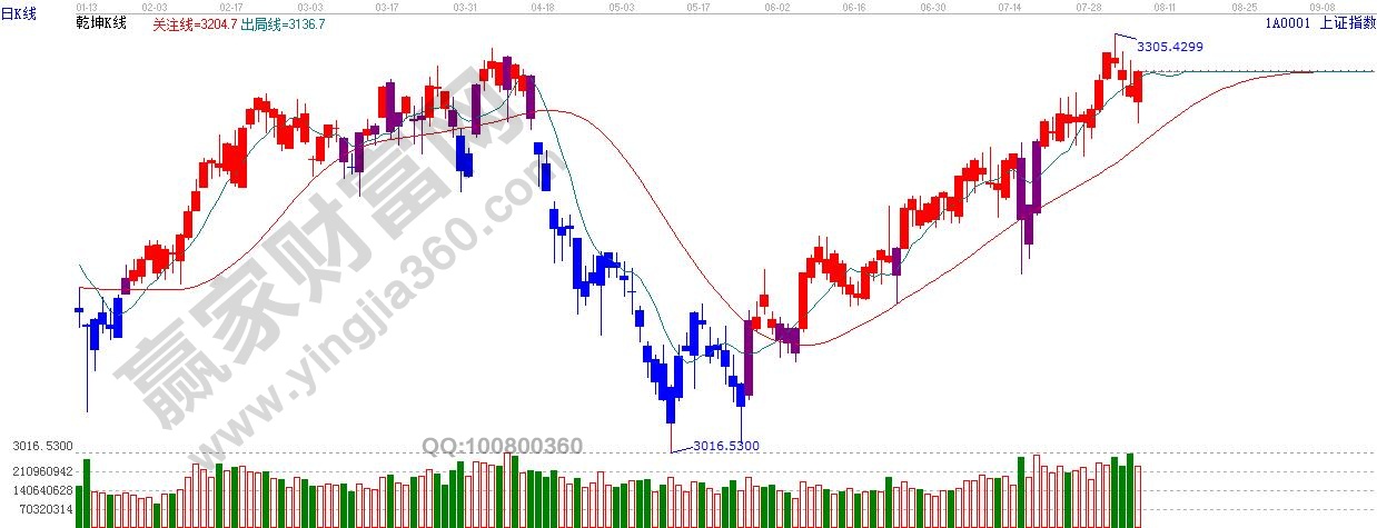 ★依據(jù)贏家江恩理論系統(tǒng)乾坤K線提示:紅色k線,滬指探底回升,尾盤收在短線出局線上方。依據(jù)規(guī)則,短線出局線之上看多。