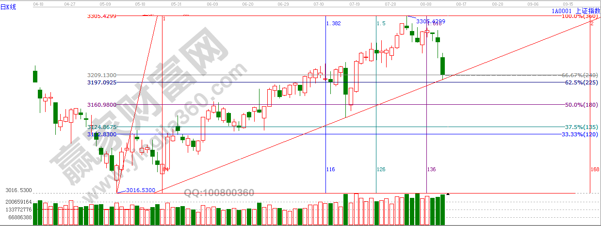 江恩看盤綜述:依據(jù)贏家江恩技術(shù)工具分析得出:周五,滬指大幅低開,震蕩后繼續(xù)跳水,最終在日線生命線3200附近獲得支撐,其實,今日的大跌,除了中鋼協(xié)發(fā)言引發(fā)的周期股大跌外,地緣政治局勢的緊張、外圍市場走低也是主要因素。接下來3200點--3180點附近支撐較強,有短線止跌基礎(chǔ)。短線的急跌往往孕育低吸的機會,時間上8月8日見頂后,下一個需要留意的時間點是8月17或者18日附近。操作上,繼續(xù)關(guān)注超跌、滯漲且有業(yè)績支撐的小盤個股,同時,把握大消費、周期股的結(jié)構(gòu)性機會。