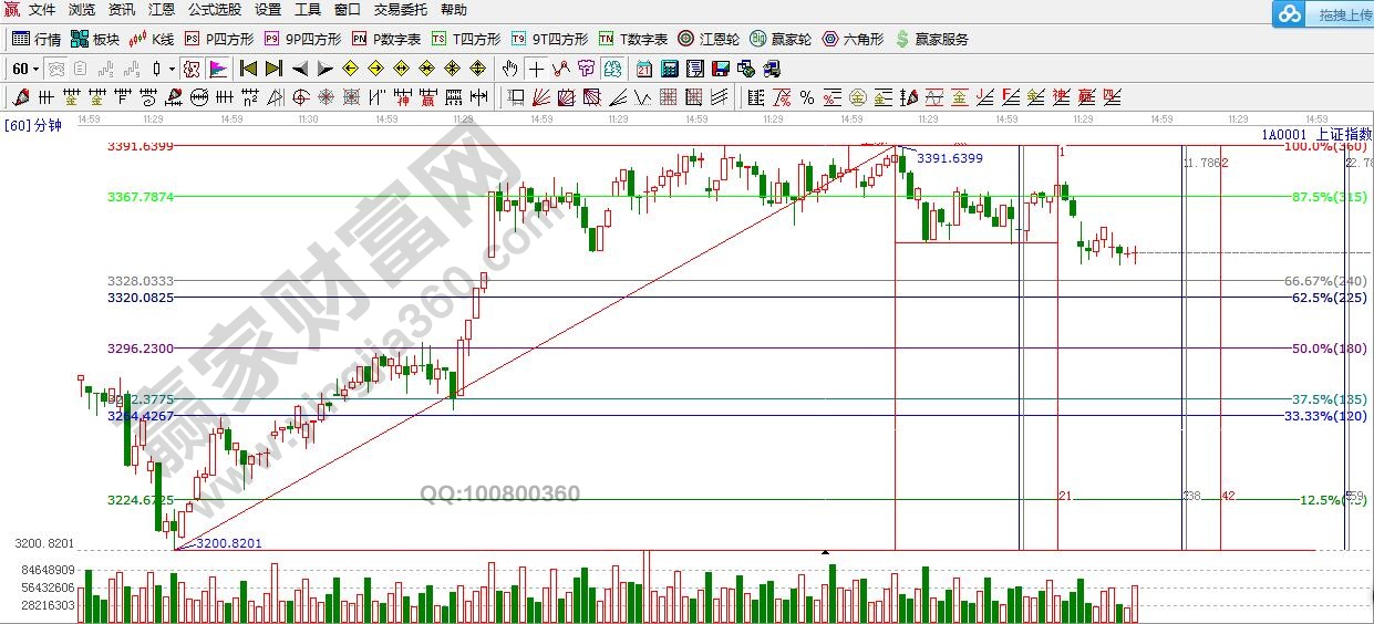 ☆依據(jù)贏家江恩理論系統(tǒng)江恩波段百分比提示:滬指低開下探,短期下方支撐3328點,或3300點附近。