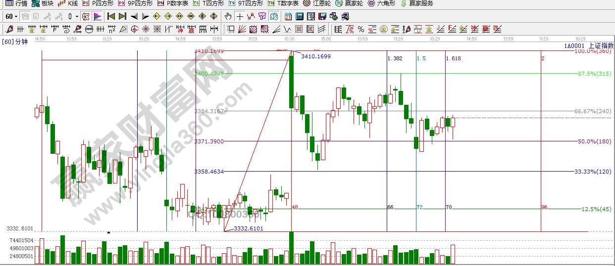 ☆依據(jù)贏家江恩理論系統(tǒng)江恩波段百分比提示:短周期阻力3384點(diǎn),支撐是3357點(diǎn),3340點(diǎn)附近。