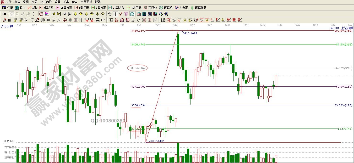 ☆依據(jù)贏家江恩理論系統(tǒng)江恩波段百分比提示:短周期阻力3384點(diǎn),支撐是3357點(diǎn),以及45度線3340點(diǎn)附近。
