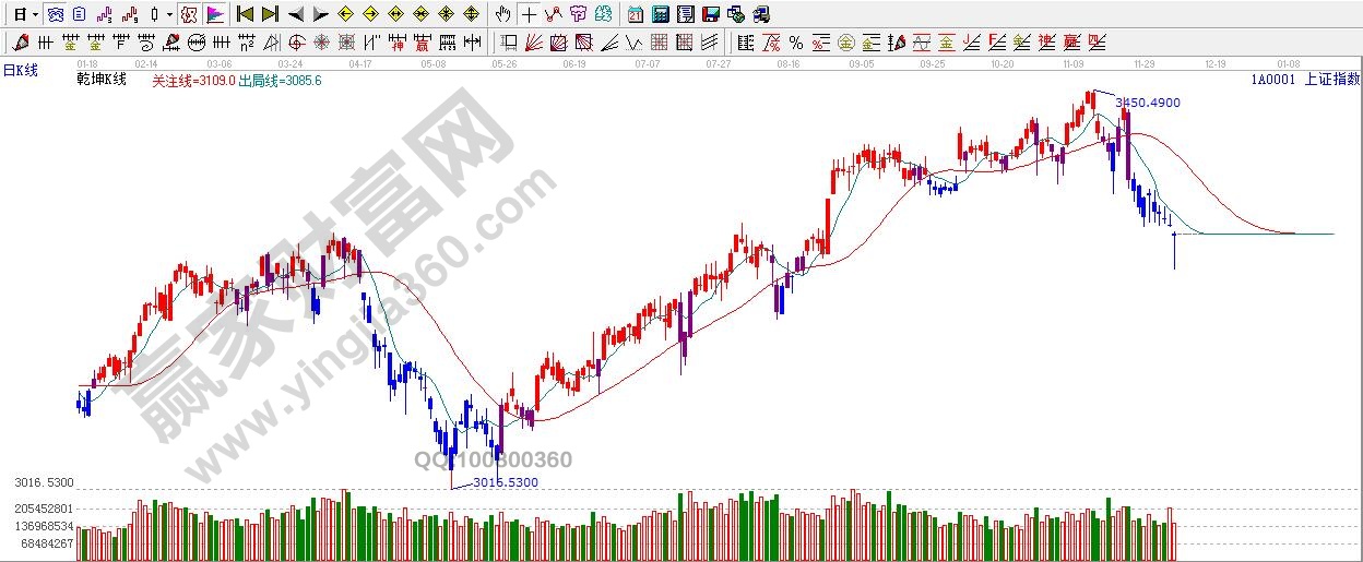 ☆依據(jù)贏家江恩理論系統(tǒng)乾坤K線提示:紅色關注線之下,k線由紫色轉變?yōu)樗{色線,依據(jù)規(guī)則,趨勢空頭。