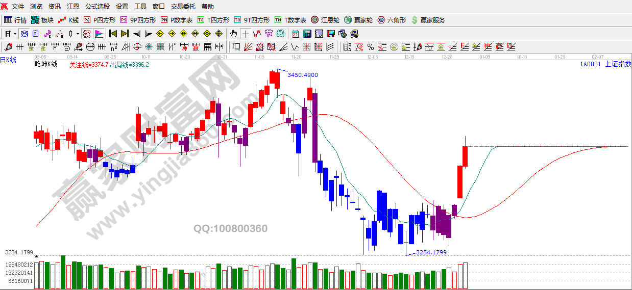 ★依據(jù)贏家江恩理論系統(tǒng)乾坤K線提示:紅色關(guān)注線之上,出現(xiàn)紅色k線,依據(jù)規(guī)則,趨勢(shì)轉(zhuǎn)多。