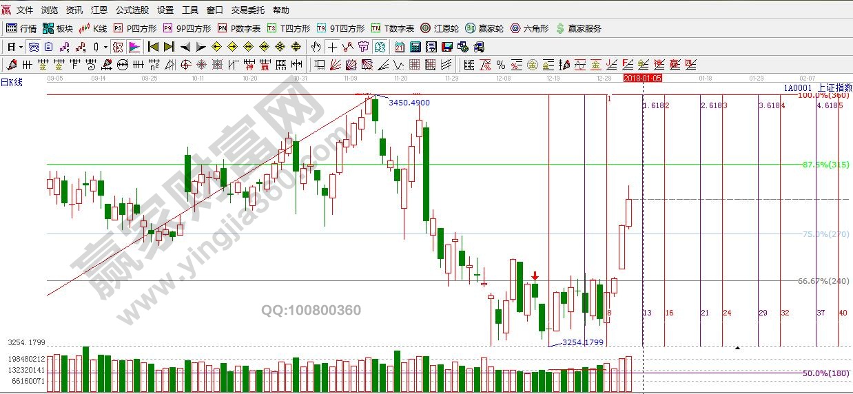 ★依據(jù)贏家江恩理論系統(tǒng)江恩波段百分比提示:滬指繼續(xù)高歌猛進(jìn),270度3342點(diǎn)轉(zhuǎn)變?yōu)橹吸c(diǎn),阻力位在315度線3395點(diǎn)附近。