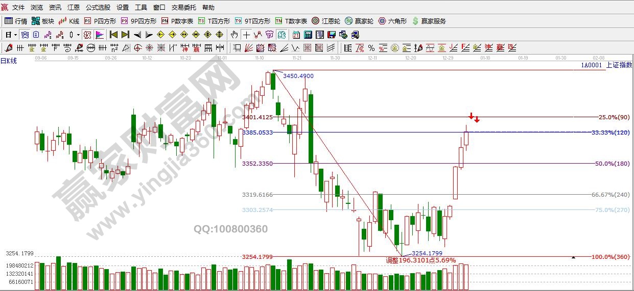 江恩看盤綜述:依據(jù)贏家江恩技術(shù)工具分析得出:周四,指數(shù)再創(chuàng)近期反彈新高,但市場展開分化,在“兩桶油”的強拉升下,指數(shù)也呈現(xiàn)上漲乏力跡象。依據(jù)百分比分析,指數(shù)連續(xù)上攻已經(jīng)接近前期套牢區(qū),點位在3385--3400區(qū)間(百分比120度--90度之間),預計短期指數(shù)或?qū)_高回落,結(jié)束短期反彈走勢,回調(diào)空間需要關(guān)注其力度和市場承接性,支撐關(guān)注日線生命線3345點附近。所以,不建議再次追進,同時逢高適當減倉下等待回落低吸良機。