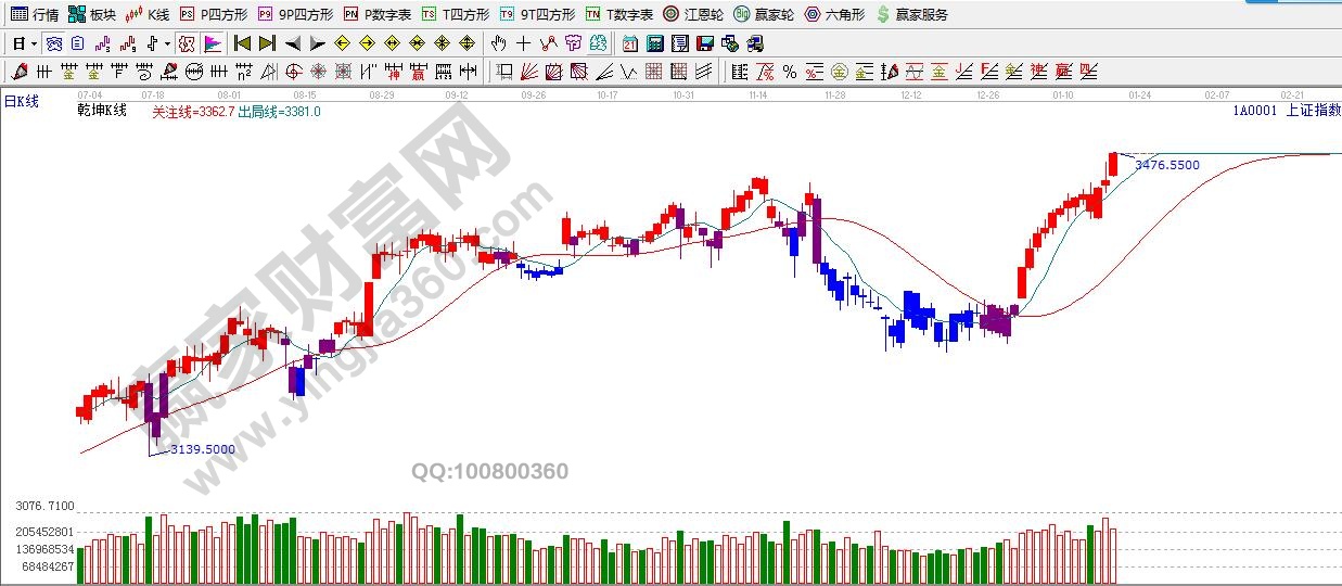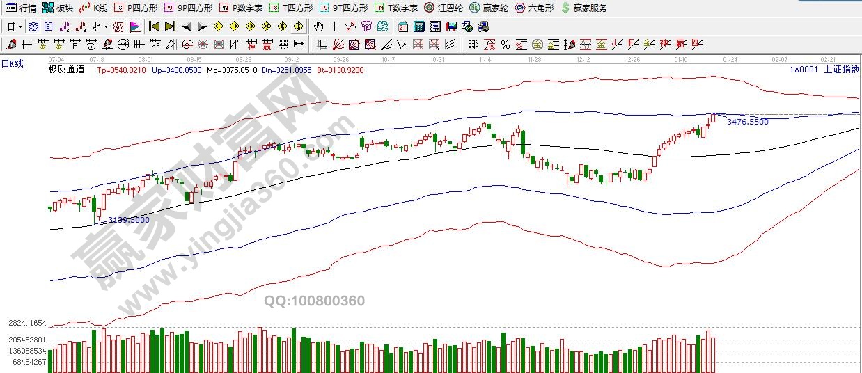 江恩看盤綜述:依據(jù)贏家江恩技術(shù)工具分析得出:周四,滬指繼續(xù)強勢上攻再創(chuàng)新高,個股出現(xiàn)連續(xù)的分化,在權(quán)重瘋狂的拉升下要謹防指數(shù)的誘多嫌疑,繼續(xù)關(guān)注極反通道藍色外軌線3478點的爭奪,依據(jù)規(guī)則,藍色外軌線會有震蕩情況出現(xiàn)。從中期角度看,繼續(xù)看好指數(shù)向上趨勢,但短期需要謹防隨時出現(xiàn)的技術(shù)性調(diào)整,尤其是金融、地產(chǎn)等標的的回落可能。操作上,建議戰(zhàn)略性適當減倉,關(guān)注超跌年報預(yù)增的標的。