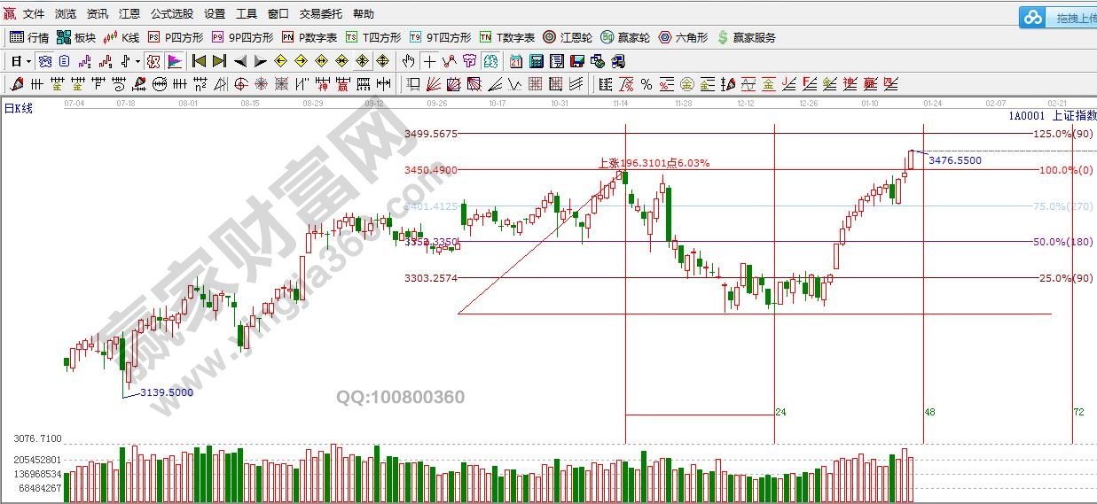 ★依據(jù)贏家江恩理論系統(tǒng)江恩波段百分比提示:滬指在創(chuàng)新高,3450點轉(zhuǎn)變?yōu)橹?,百分比目標位?0度3499點附近。