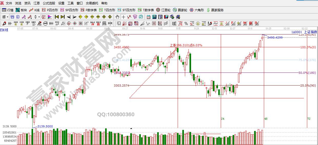 ★依據(jù)贏家江恩理論系統(tǒng)江恩波段百分比提示:滬指向上跳空延續(xù)強(qiáng)勢(shì),最高觸及提到的江恩90度3499點(diǎn)位置,繼續(xù)關(guān)注此位置的拋壓,支撐依 舊關(guān)注前期高3450點(diǎn)附近。