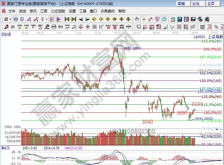 ★依據(jù)贏家江恩理論系統(tǒng)波段百分比延伸線提示:日線在零度位3097點(diǎn)上震蕩,此線不破上方阻力是45度3154點(diǎn)。