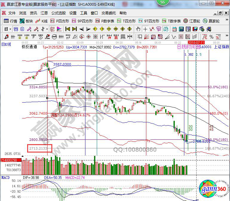 ☆依據(jù)贏家江恩理論系統(tǒng)波段百分比延伸線提示:日線跌穿180度2800點,按照規(guī)則看低一線至240度2713附近。