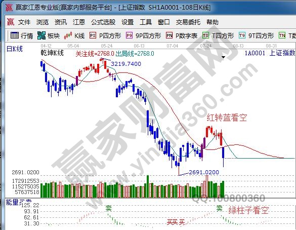 ☆依據(jù)贏家江恩理論系統(tǒng)乾坤K線提示:日線K線顏色紅轉(zhuǎn)藍波段看空,收盤在紅色關注下線,短線、波段做空。