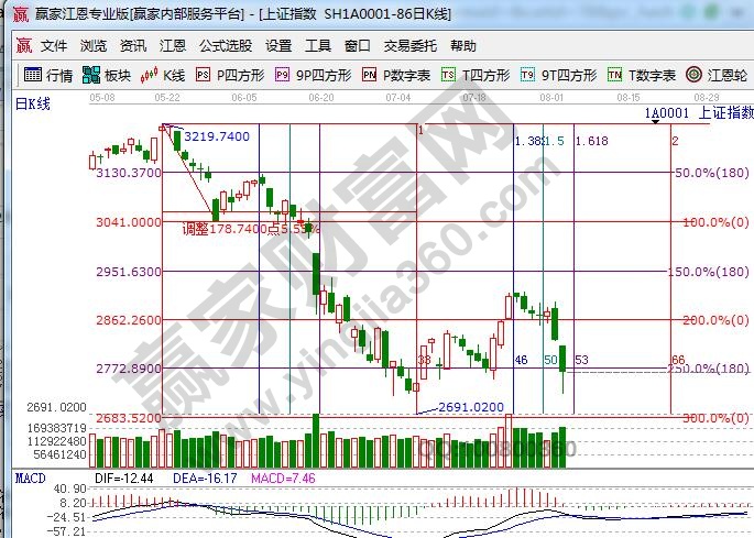 江恩看盤綜述:通過江恩理論系統(tǒng)趨勢、時間、價格工具綜合評判市場一星看多(五星評級標準)。大盤日線受生命線反壓下跌向藍色下軌線尋找支撐,短周期15、30、60分鐘時價共振是下跌途中的暫緩信號;空間上,江恩百分比延伸線顯示,連續(xù)兩日市場擊破零度、180度對應的2862點、2772點,2772點反復不能收復則直逼新低; 時間上,日線時間點是明天及下周一,周線時間窗是8月16,大盤月線極反通道藍色下軌線是2680附近,等待時間窗口是否與價格形成共振,在此期間多看少動,弱勢行情下本金安全是第一位。