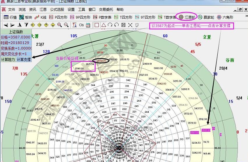 ☆依據(jù)贏家江恩理論系統(tǒng)江恩輪中輪提示:以3587為起點(diǎn),做江恩輪上輪時空分析圖??臻g上受阻2615壓力點(diǎn),突破則進(jìn)入下個角度2690;反則,將繼續(xù)確認(rèn)2540支撐。