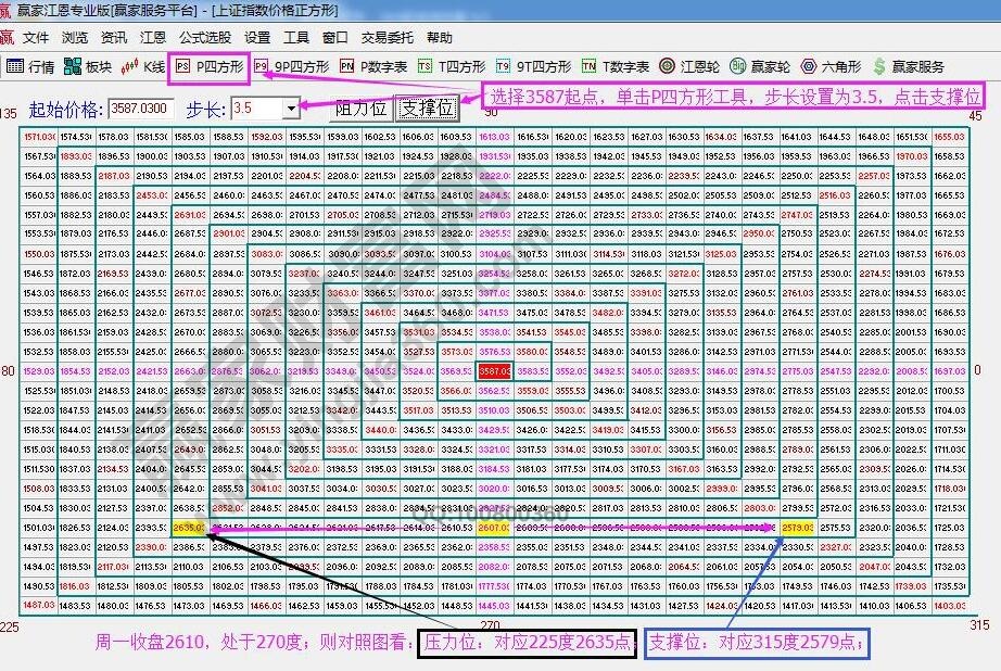 ★依據(jù)贏家江恩理論系統(tǒng)江恩價格四方形提示:以3587為起點(diǎn),做江恩價格四方形圖。周一收盤2610點(diǎn)處于270度位置,則,周二22日支撐位2579,壓力位2635。