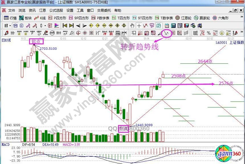 ★依據(jù)贏家江恩理論系統(tǒng)轉(zhuǎn)折趨勢線提示:以2703為起點(diǎn),2440為終點(diǎn)做轉(zhuǎn)折趨勢線,周一指數(shù)剛好高開在2598后獲得支撐震蕩走高。當(dāng)前2598為支撐,站穩(wěn)則看高壓力2644點(diǎn),失守則考驗(yàn)2576點(diǎn)。
