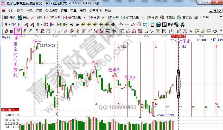 ☆依據(jù)贏家江恩理論系統(tǒng)黃金時間周期線提示:以最近兩組高高點(diǎn)做圖,第一組(2827和2703),第二組是(2666和2645)做黃金時間周期線,下個時間窗口1月23、24號。