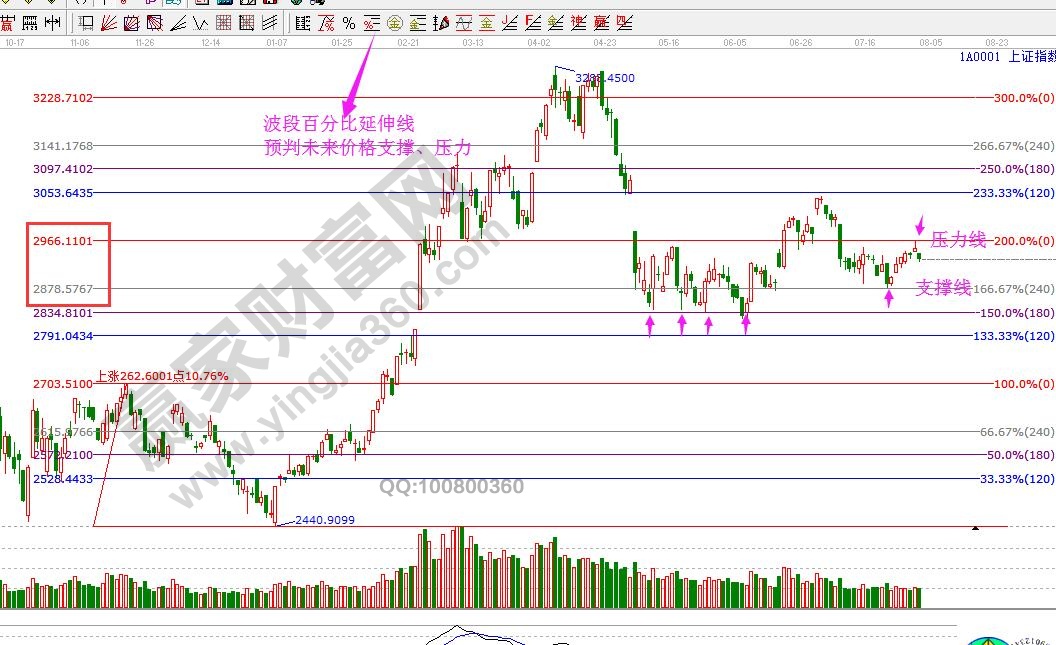 ☆依據(jù)贏家江恩理論系統(tǒng)波段百分比延伸線提示:以2440點為起點,2703點為終點做圖,指數(shù)8號中陰擊破零度2966點后弱勢震蕩,連續(xù)兩度試探240度2878點支撐走強,上攻至零度位2966點壓力回落,此線不能快速突破,則有再度下探動作。