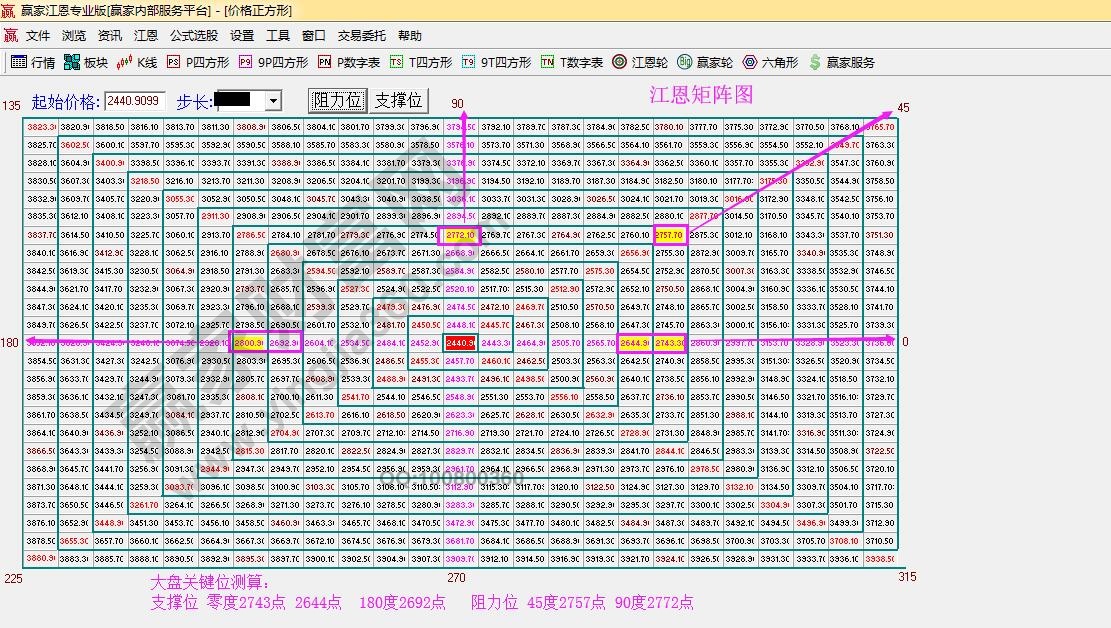 ☆依據(jù)贏家江恩系統(tǒng)江恩價格四方形分析:4號盤中壓力2757、2772點,盤中支撐2743、2692、2644點,0度位2743失守短期看空。