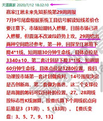 7月12號(hào)贏家江恩VIP學(xué)員周報(bào)內(nèi)容如下圖,本周第一種路徑關(guān)鍵位3340±10,第二種路徑關(guān)鍵位3280點(diǎn)。7月14號(hào)午盤分析對(duì)關(guān)鍵位再度進(jìn)行解讀。