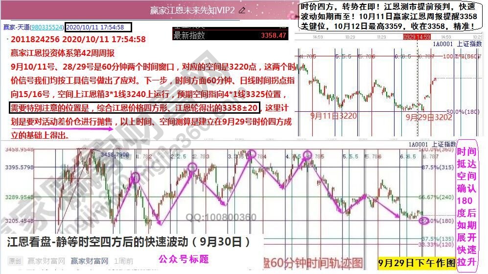 公眾號yingjiajiangen江恩看盤標題直接強調(diào)“靜等時空四方后的快速波動”,注意關鍵詞“快速波動”。實則,對照60分鐘的時價分析圖,時間抵達空間確認180度關鍵位形成四方點;11日高開高走,12日繼續(xù)高開高走,強勢收在3358點。此點位在11日周報預期中特別強調(diào),完美抵達,29日前后低吸的倉位收獲滿滿。(預判市場快速波動的條件是什么?上周六VIP內(nèi)部培訓課有詳細講解)